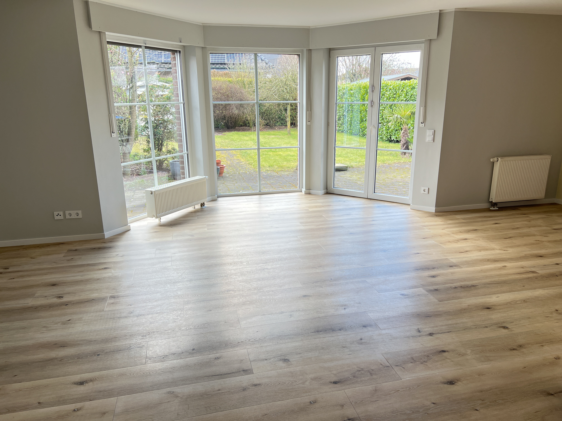 Über das Wohnzimmer gelangt man zur nach Westen ausgerichteten Terrasse und den geschützt gelegenen Garten, der zur allen Seiten an Nachbargrundstücke grenzt.