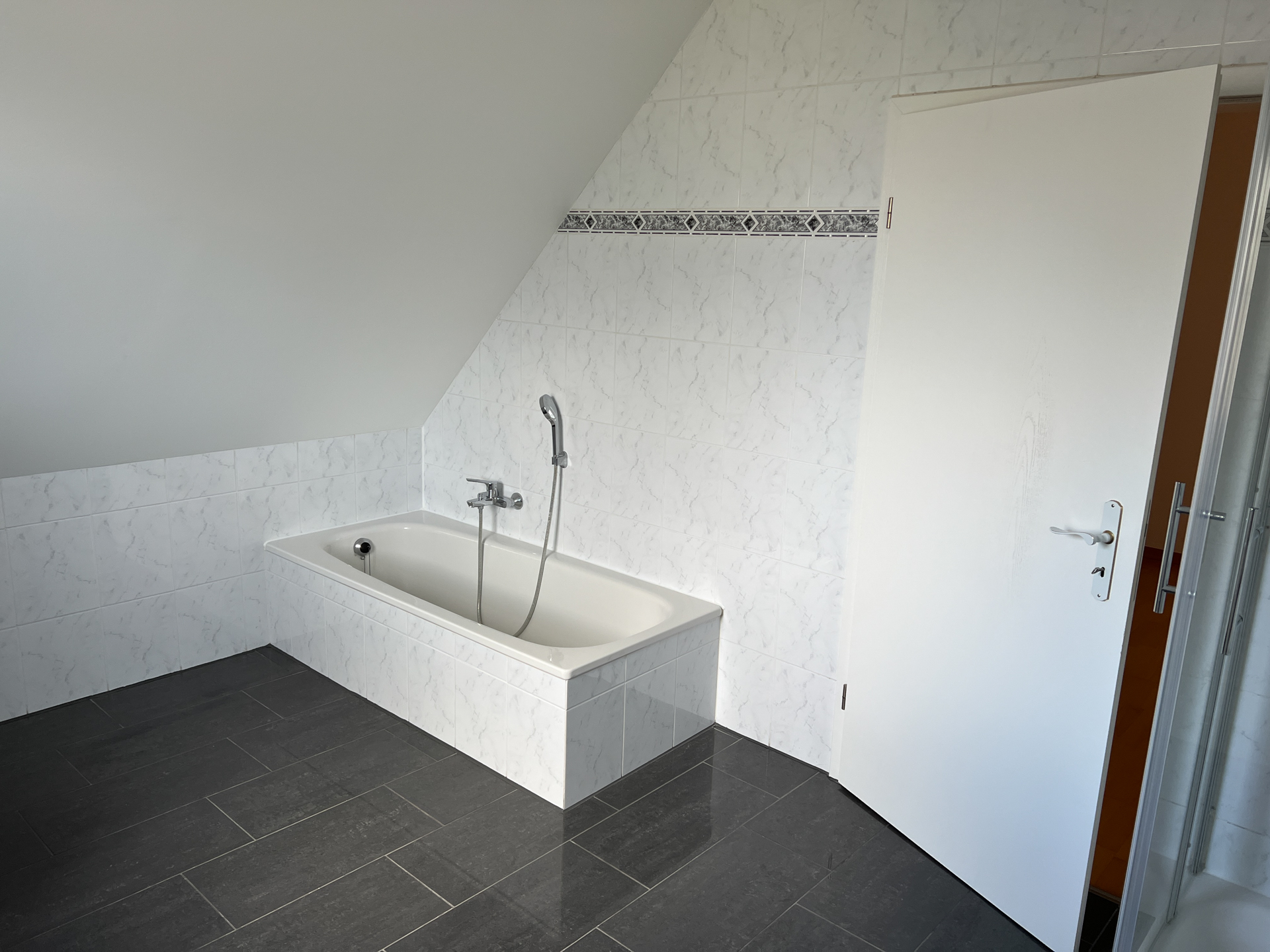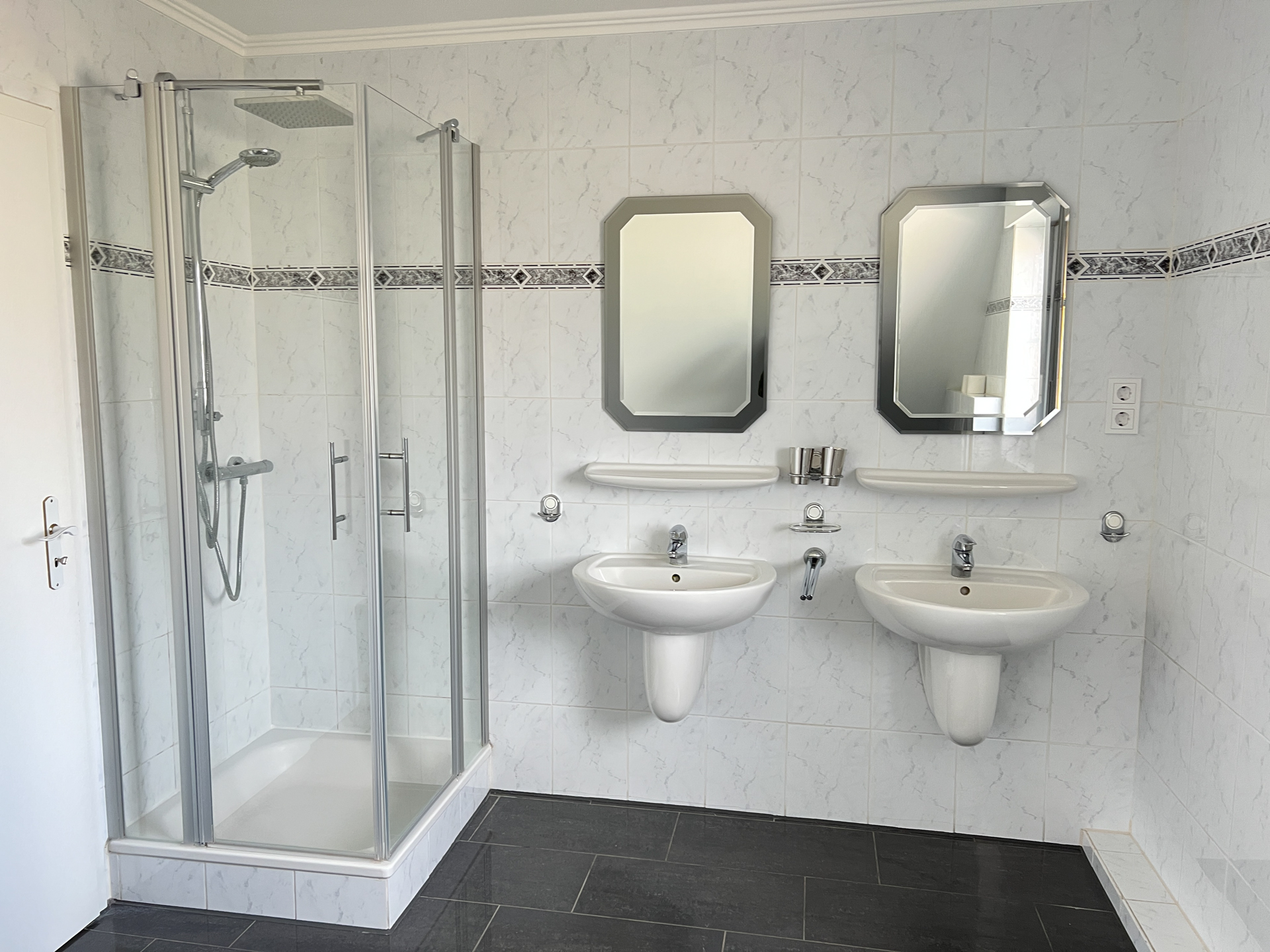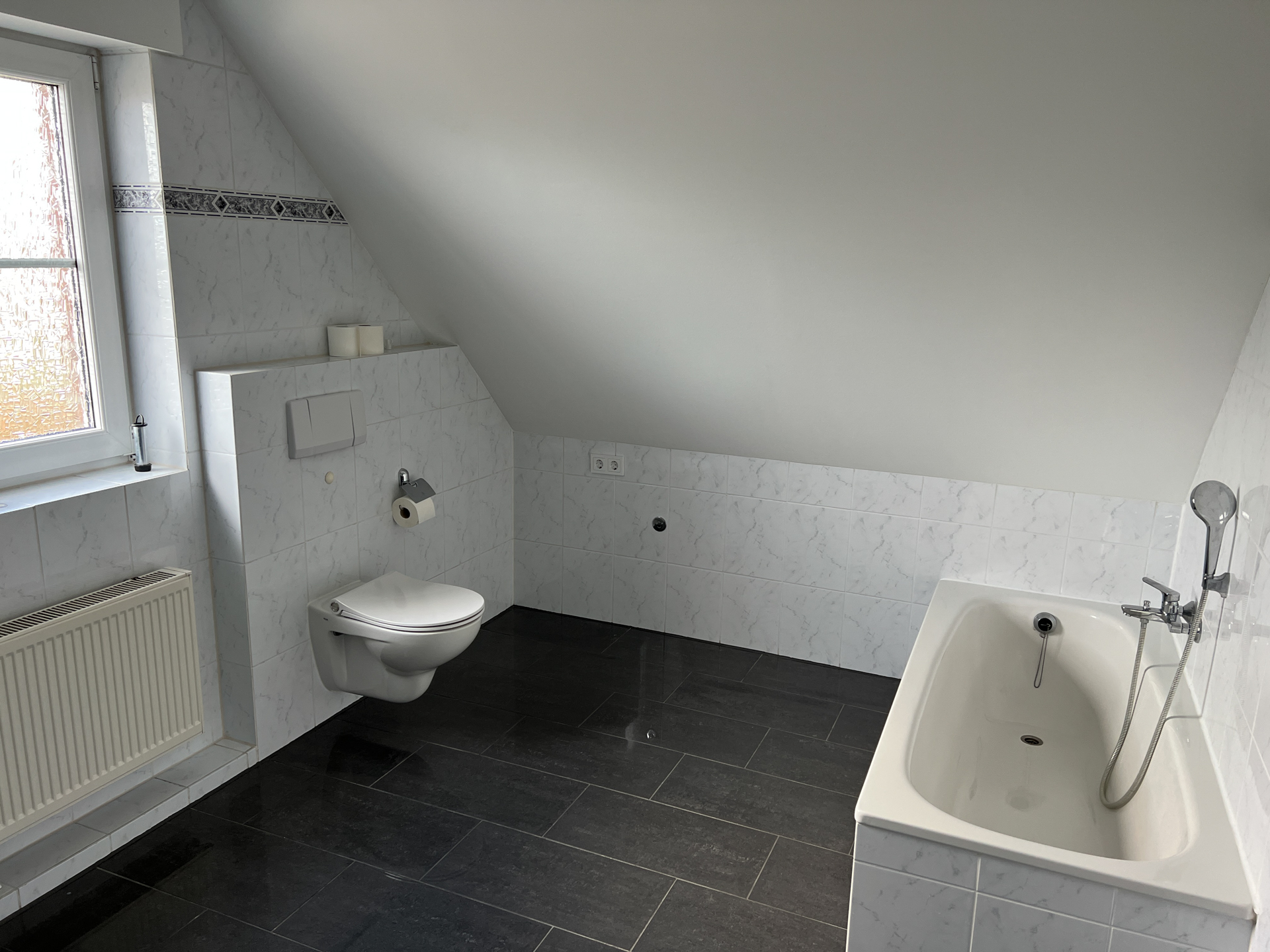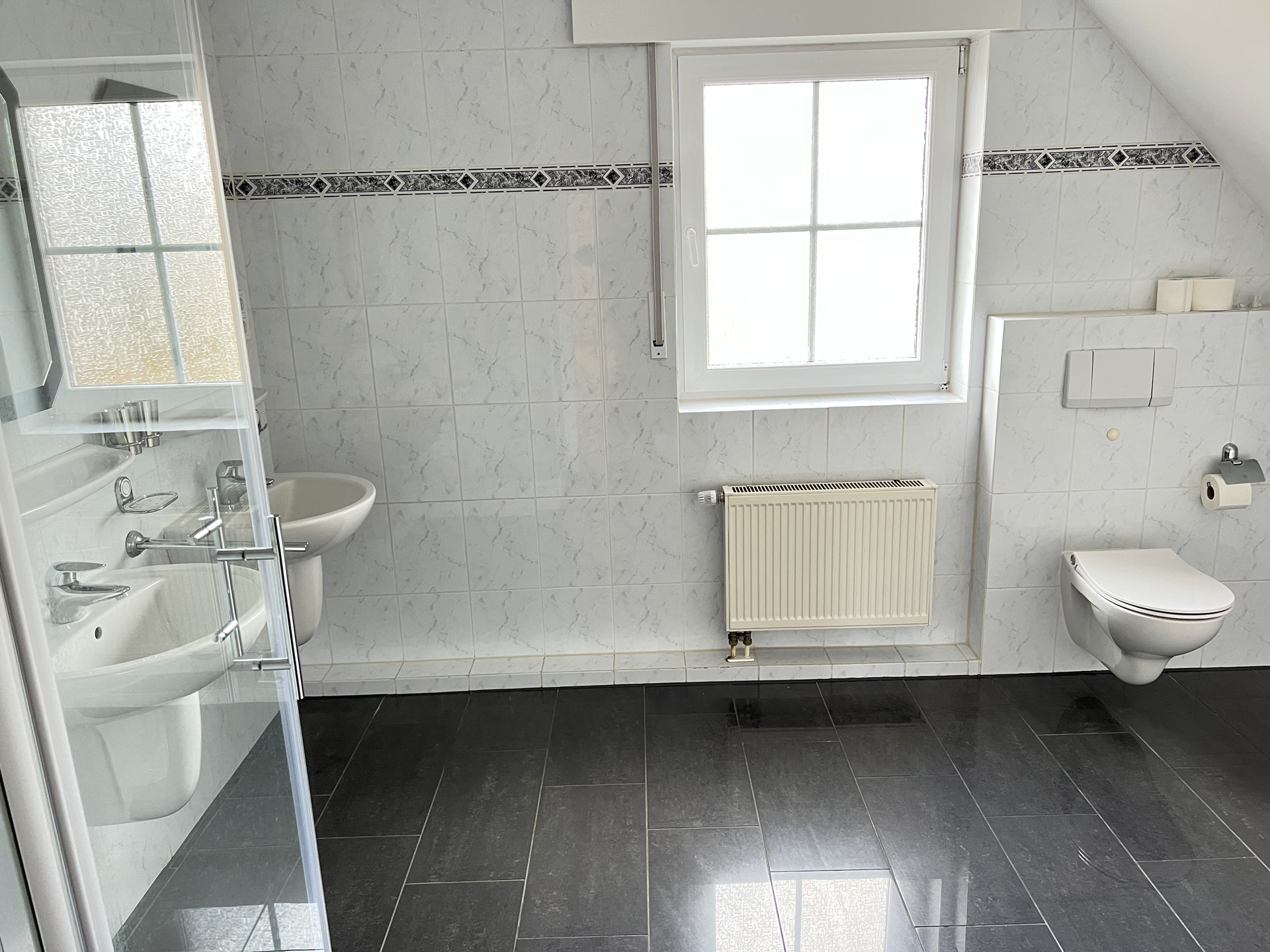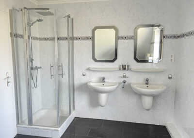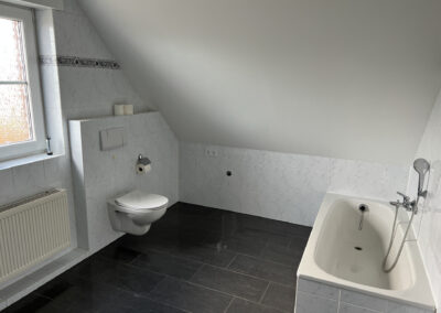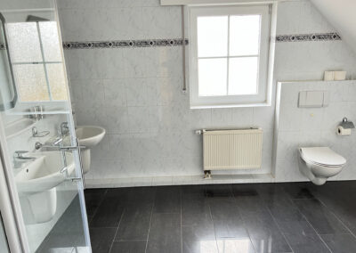 Das Badezimmer ist mit einem Fenster, einer Badewanne, einer Dusche, zwei Waschtischen, einem WC und einem möglichen Waschmaschinen-Stellplatz ausgestattet.