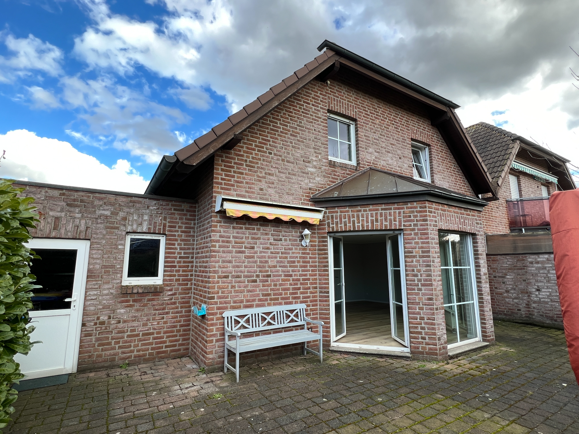 Die gepflasterte Terrasse erstreckt sich über die gesamte Briete des Hauses.