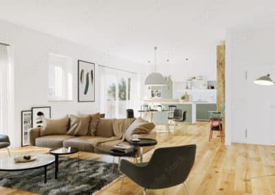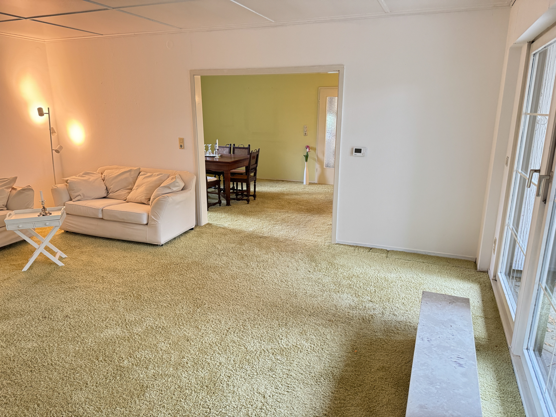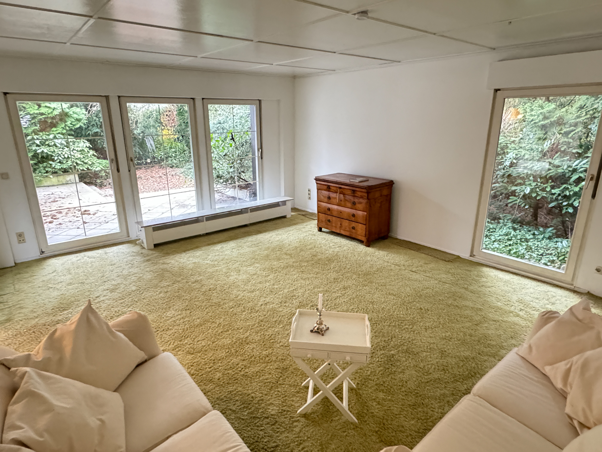 Ein großzügiges Wohnzimmer mit angeschlossenem Esszimmer bildet das Herzstück des Hauses. Von hier, sowie von einem der drei Schlafzimmer, gelangt man direkt auf die geschützt und blickdicht gelegene, ca. 27 m² große Terrasse, die zum Entspannen oder Essen im Freien einlädt.