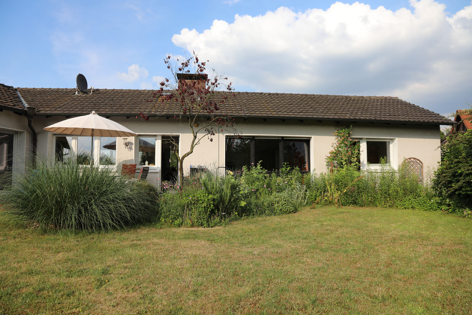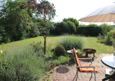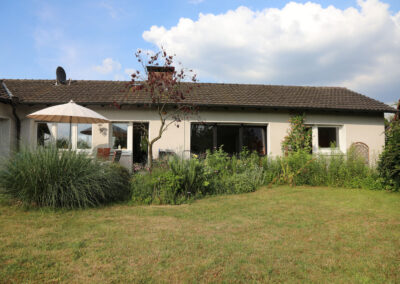 Der uneinsehbare, nach Süd-West ausgerichtete Garten bietet einen Blick ins Grüne. Er ist über die Terrasse und über einen gepflasterten Weg der neben dem Haus verläuft, zu erreichen.