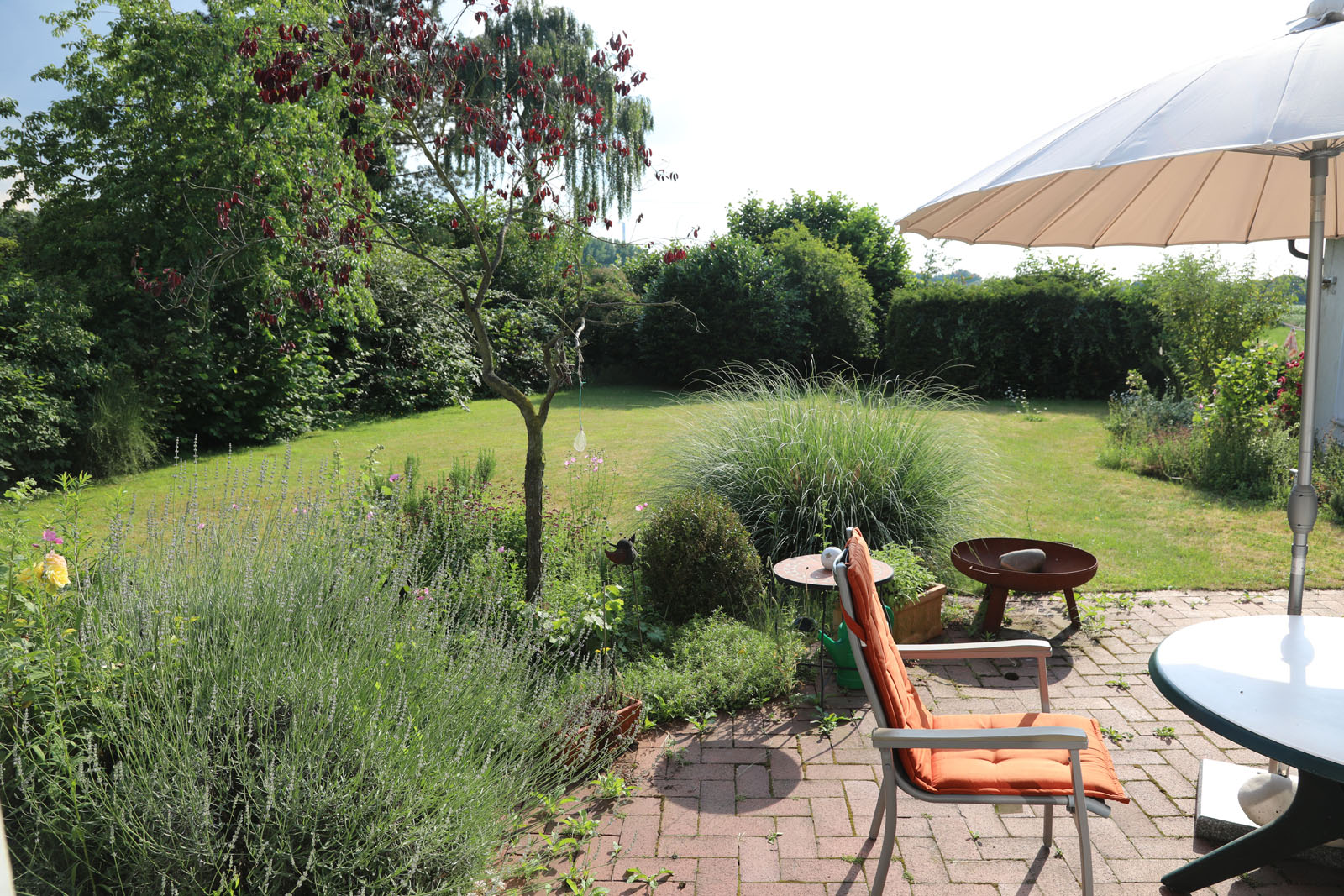 Direkt hinter dem durch Hecken umgebenen Garten befindet sich ein Feld.