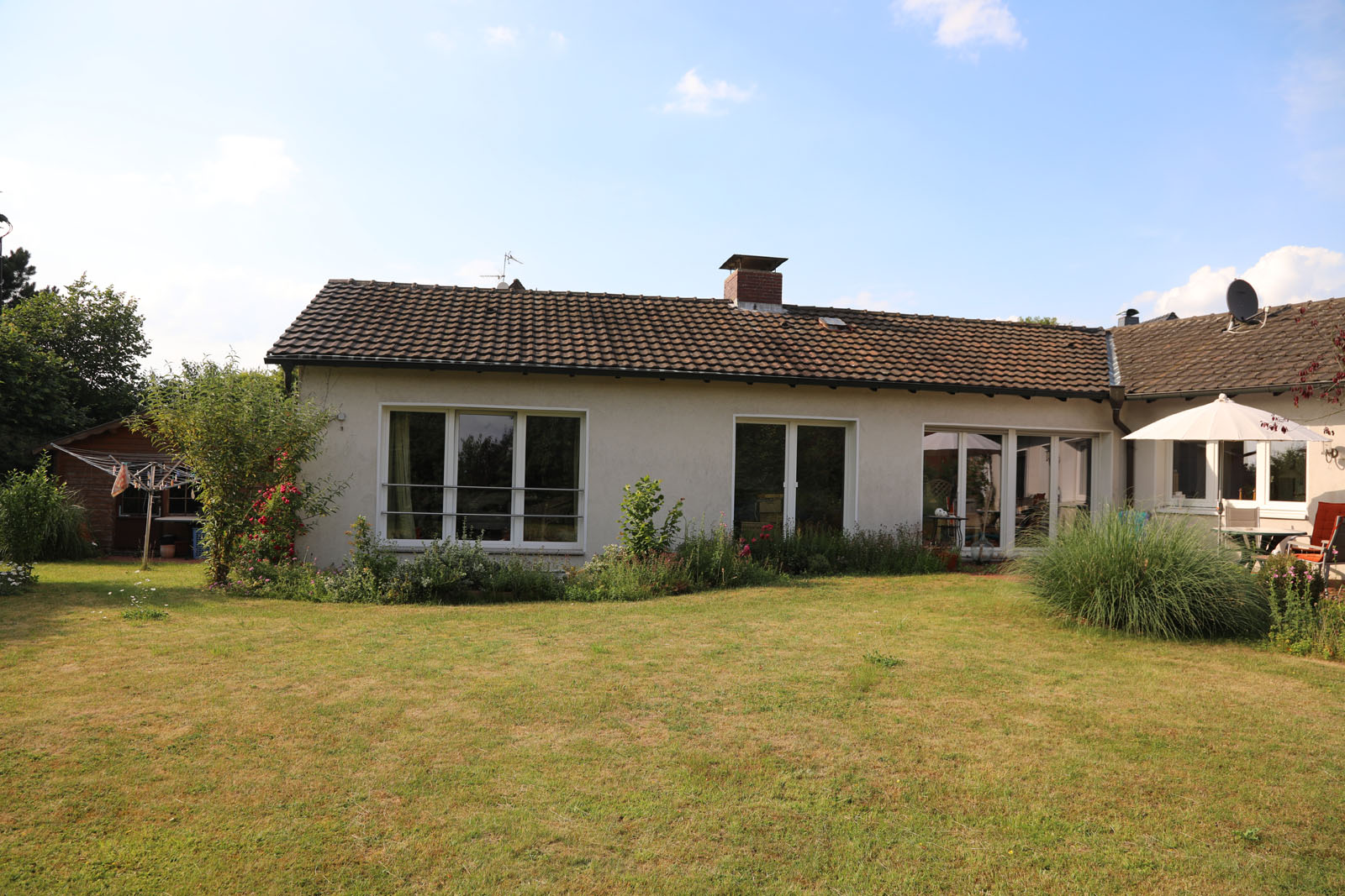 Der jüngst modernisierte, sehr gepflegte, freistehende und vollunterkellerte Bungalow mit Einliegerwohnung und Einzelgarage befindet sich auf einem 1.094 m² großen, am Feldrand und attraktiv gelegenen Grundstück.